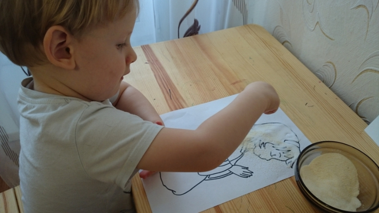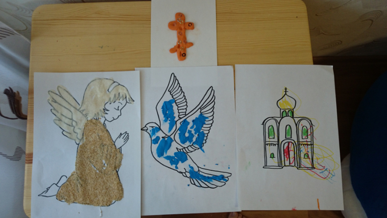 Песни ставила фоном во время творческих занятий. Украшали крест. Раскрасили храм, как смогли в силу возраста))). Украсили ангела крупой. Голубя сделали в технике пластилинографии, делали первый раз, купила специально очень мягкий пластилин, сыну очень понравилось. Делала сенсорную коробочку, с которой очень долго возились. Сначала искали ангела, шарики, крест, потом прятали ангела, потом просто пересыпали манку из емкости в емкость.