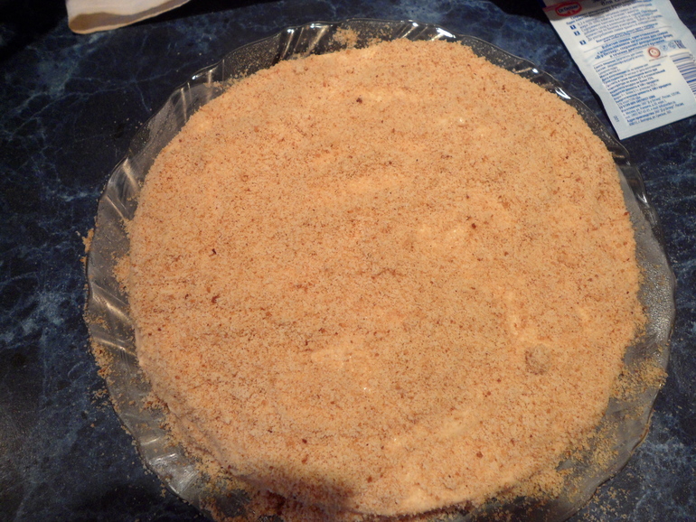 Посыпать сверху крошкой, и с боков тоже.