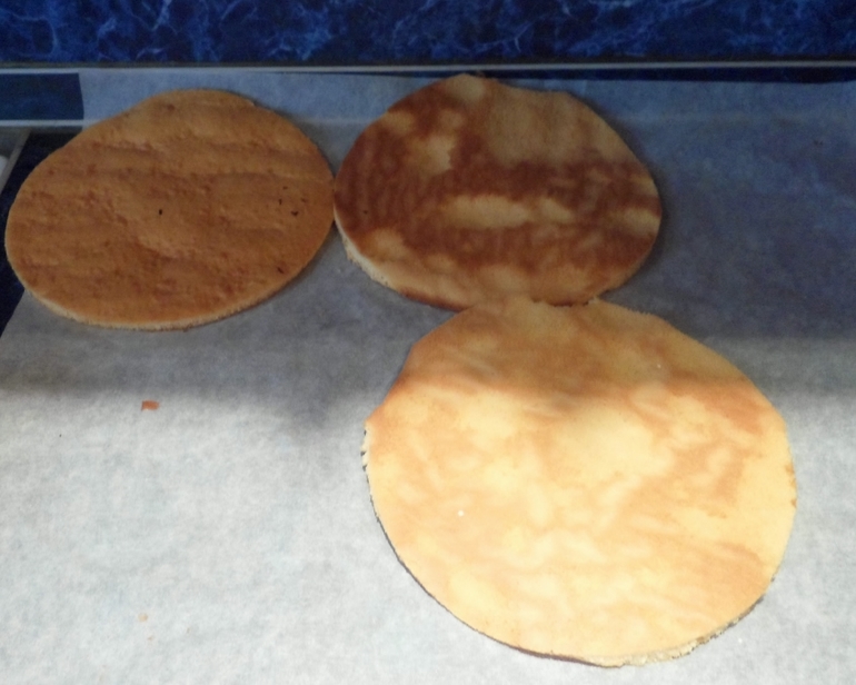 Таким же образом испечь остальные коржи. У меня получилось три больших коржа из которых я вырезала 6ть заготовок на 2 торта.