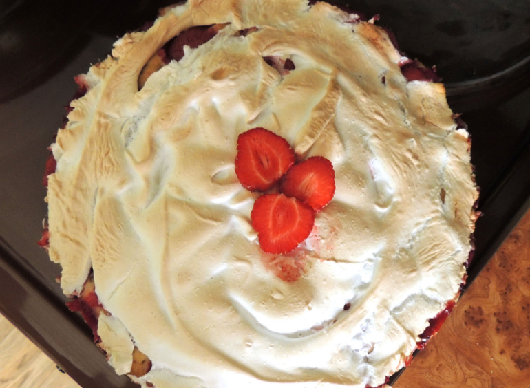 Все перемешать, выложить в форму, сверху уложить ягоды. Поставить в духовку 200 С на 30 минут. Тем временем, взбить 2 белка со 100 г сахарной пудры и щепоткой соли в густую пену и выложить эту массу на почти готовый пирог, увеличить температуру до 250 С, выпекать пока не подрумянится безе, около 2 минут. Посыпать сахарной пудрой перед подачей!