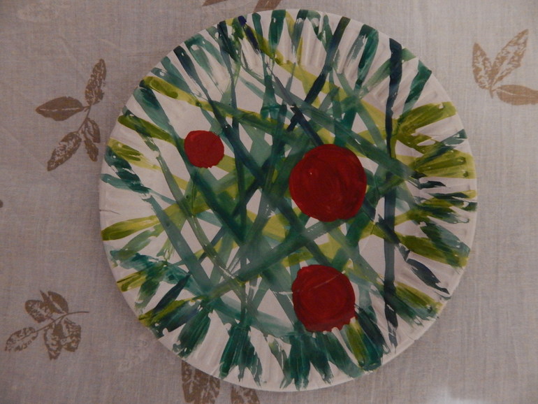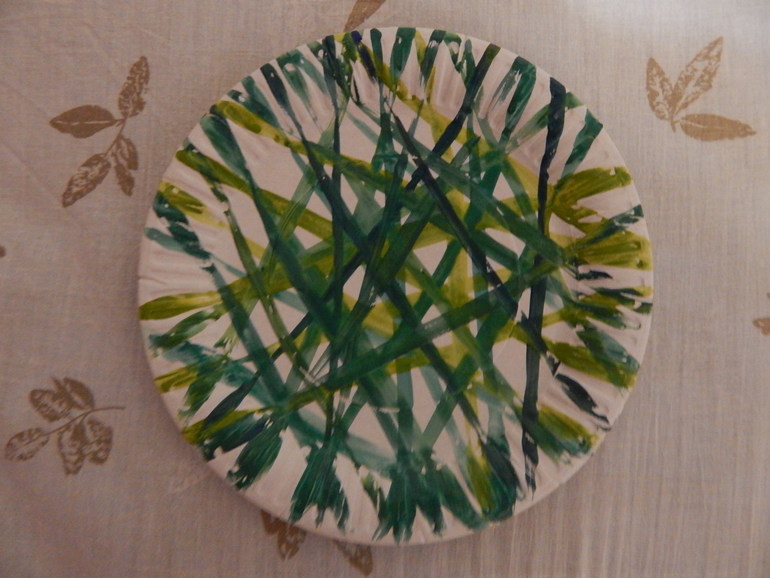 1. Нарисуйте на тарелочке полосочки зеленым цветом травку (от края до края тарелочки).