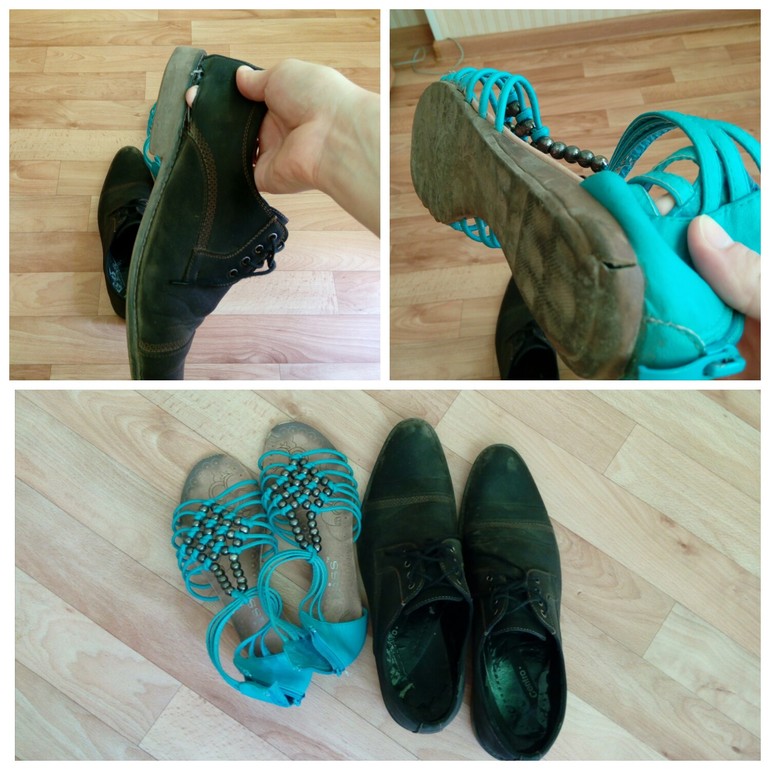И сегодня у меня опять старенькая обувочка - мои горячо любимые босоножки (вчера ходила в них и поняла, что пяточки очень болят от такой подошвы) и ботинки мужа. специально сделала коллаж, чтобы мужу было понятно, что с этими ботинками уже ничего не сделать.