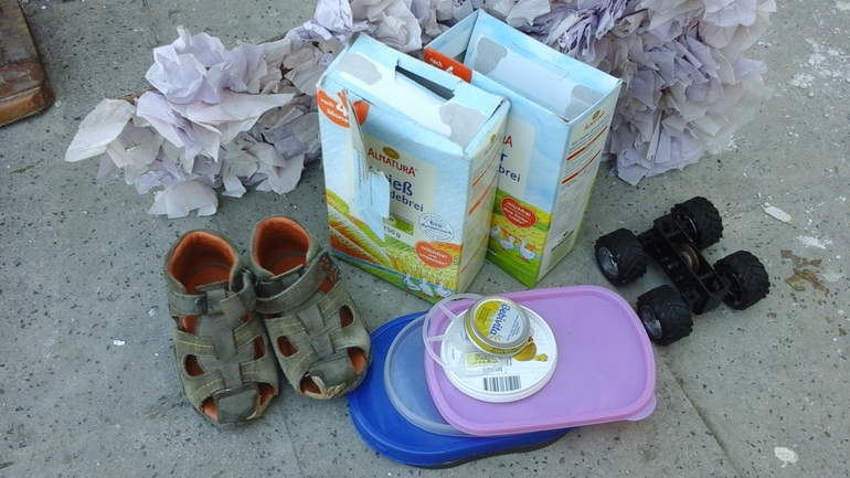 повторюсь за многими-крышки :), стёртые детские босоножки, гафрированая единичка, старые детские каши, остаток от машинки.