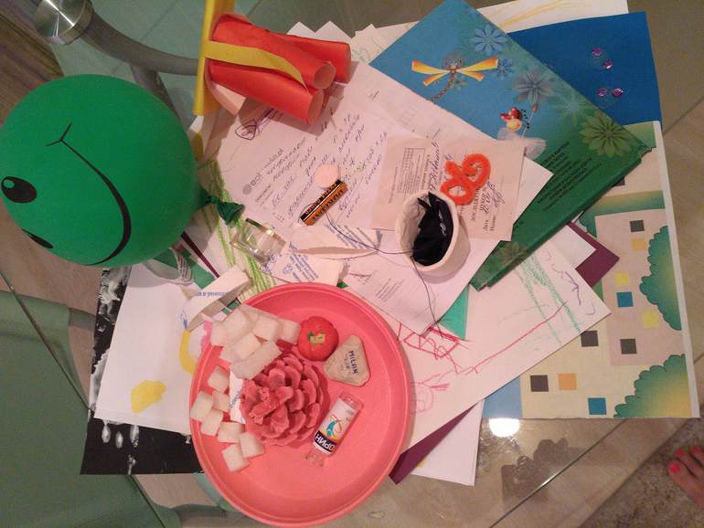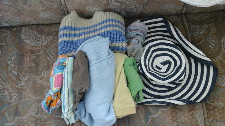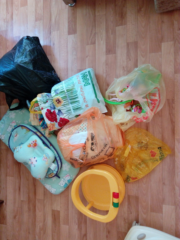 Я добралась до детских вещей - вывожу на хранение коляску(на фото ее мягкие части) пакет с пеленками, пакет с мобилем, пакет с детской одеждой два матраса, ортопедическую подушку круг и стул для купания.