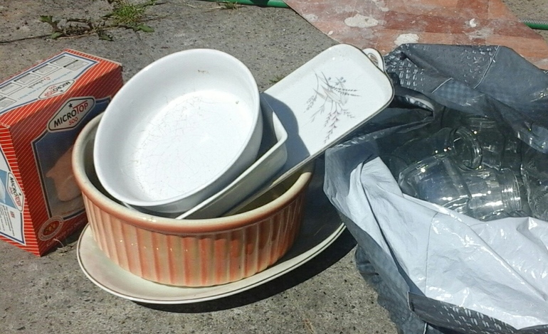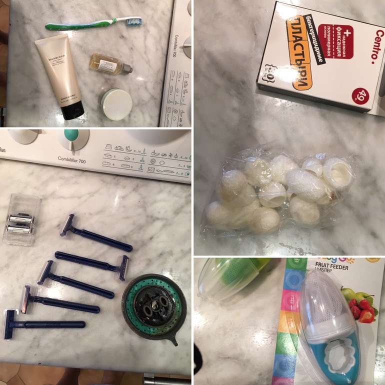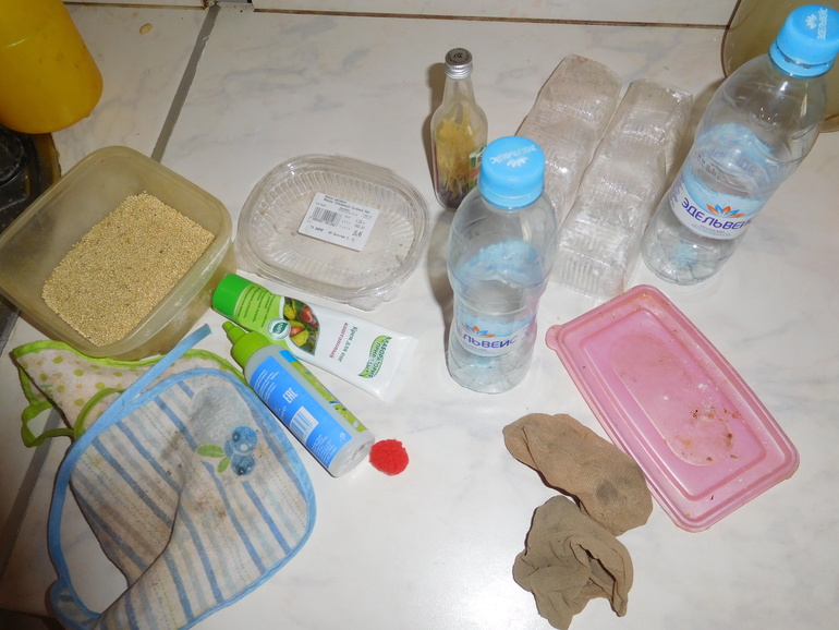 бумаги и черновики из отдела для творчества, крышки пластиковые из-под контейнеров, банка из-под соды, пакет из-под трубочек для коктейлей, авиа билет супруга, расписание занятий июньского детского лагеря,мягкая игрушка мишка-одноглазый, отбитая рука фарфоровой куклы (зачем дочка её хранила???), бабочка (украшение?), наклейки в виде треугольников, две старые банковские карты, карандаши ИКЕЯ, синтетическая розовая наволочка, разговорник немецкого языка, путеводитель по Новосибирску за 2005 год.