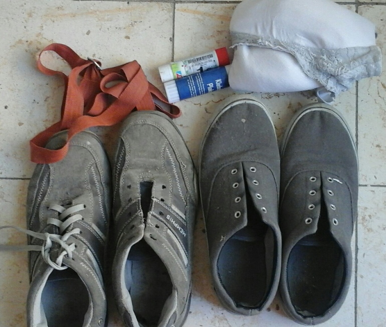 Сына обувь, одни на выброс, вторые в контейнер, 2 сухих клея карандаша, веревка и мой старый бх.