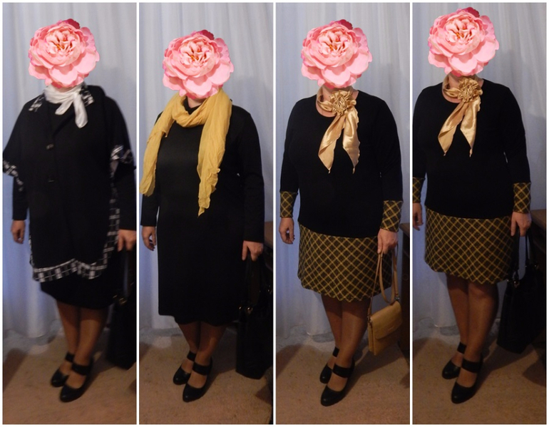 Вот что получилось у меня. Взяла капсулу на основе двух платьев, так как брюки и юбки сейчас почти не ношу. Туфли правда другие, но они тоже черные. Капсула для работы. Работаю педагогом. Поняла, что мне необходим бежевый тренч.