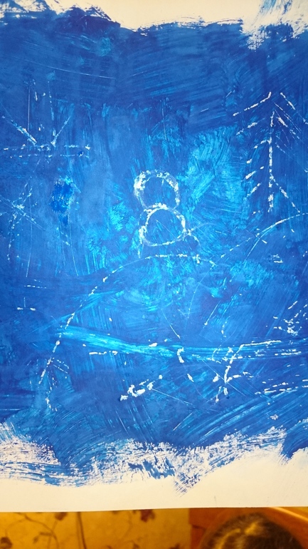 Убедившись, что лист хорошо натёрт воском, начинаем покрывать сверху чёрной гуашью (можно взять синюю). Другие цвета давайте не использовать у нас же марафон зимний)))