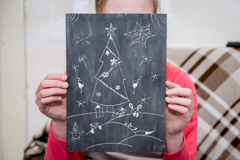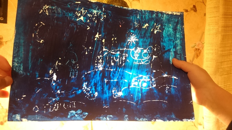Берём острую палочку и начинаем выцарапывать наш зимний рисунок!