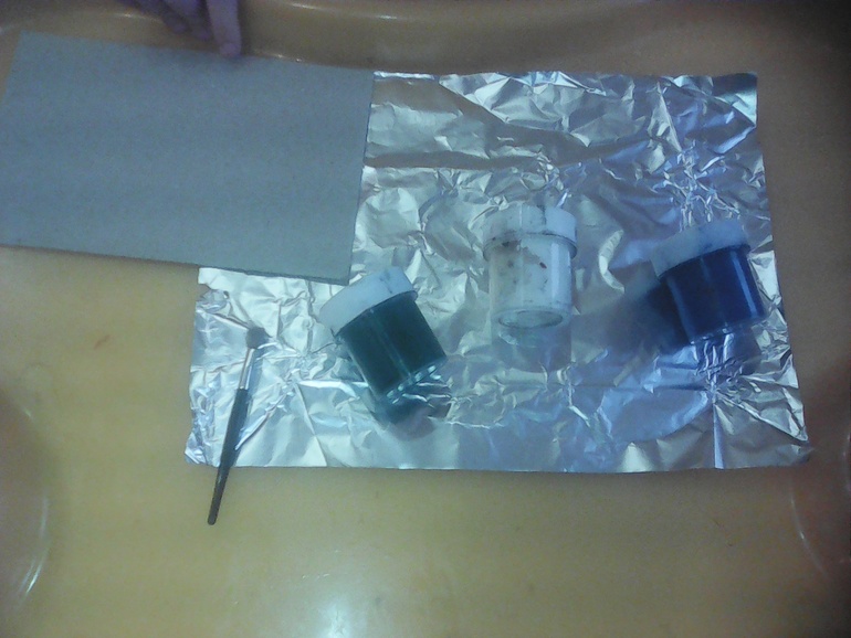 - кисти и краски, рекомендую взять кисти по количеству цветов краски. Краски - синий, белый и зелёный.