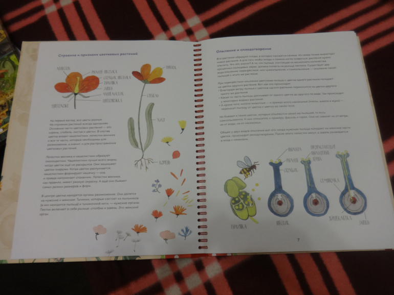 Далее описаны признакии и строение цветковых растений, процесс опыления и оплодотворения.