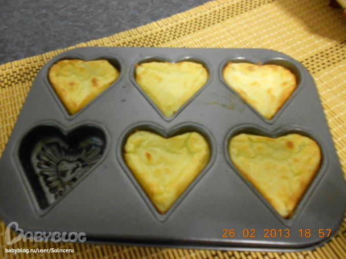 Суфле очень вкусное, сынок съел практически все сердечки. А вот и рецепт - сварить манную кашу из 1/4 стакана воды + 3/4 стакана молока, добавить ч.л. масла сливочного и сахар по вкусу. Я брала 1 ст.ложку, было не оч сладко. Охладить немного. Взбить 1 яйцо и добавить в кашу, всё перемешать. Форму хорошо смазать маслом и на 2/3 заполнить массой. Поставить в духовку на 180 гр минут на 20, не меньше. А для подливки я нашла в морозилке клубнику перетертую с сахаром, разогрела в кастрюле и полила суфле. Получилось очень вкусно, просто очень. А какой аромат!