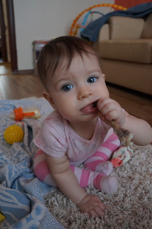 Глазёша изумительная)Особенно когда грызёт кость)А у меня Лен бзик такой, я терпеть не могу когда дети всё по себе размазывают. Никогда не дам самой есть пока аккуратно не будет есть.Сейчас бьюсь за чистый нагрудничек при каждом кормлении) Короче задвиги у мамаши.