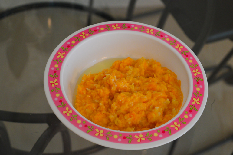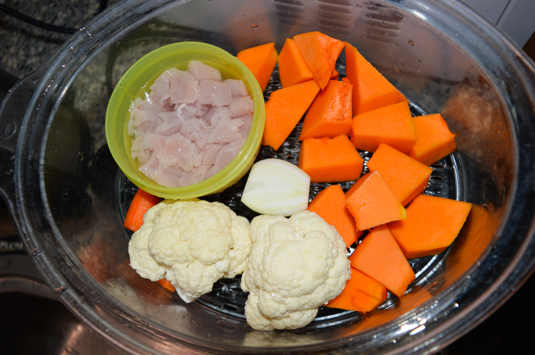 Всё загрузила в пароварку на 25 минут. Затем взбила погружным блендером индюшку с бульоном, лук и морковь. Тыкву и цв. капусту помяла вилкой в отдельной тарелке. Соединила все ингредиенты. В порцию добавила немного оливкового масла. Обычно подсаливаю пюрешки, но тыква сладкая, поэтому здесь соль совсем не нужна.