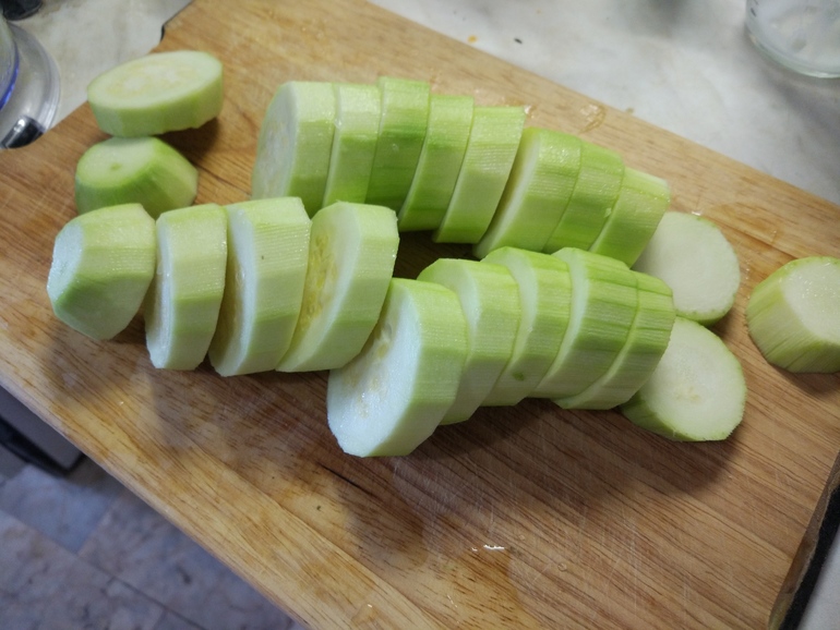 Кабачки мою, чищу и режу на кружочки толщиной 1,5-2 сантиметра