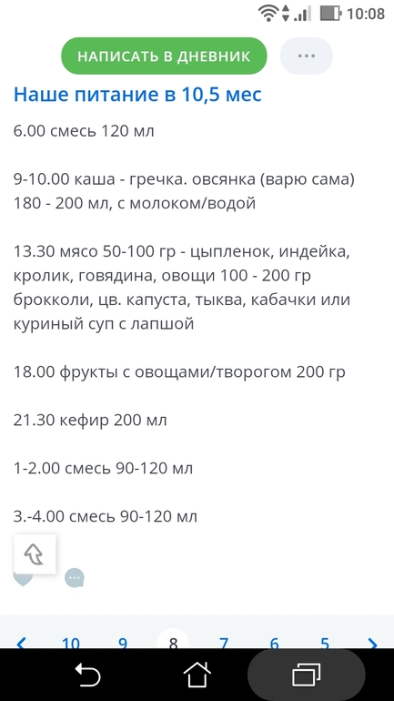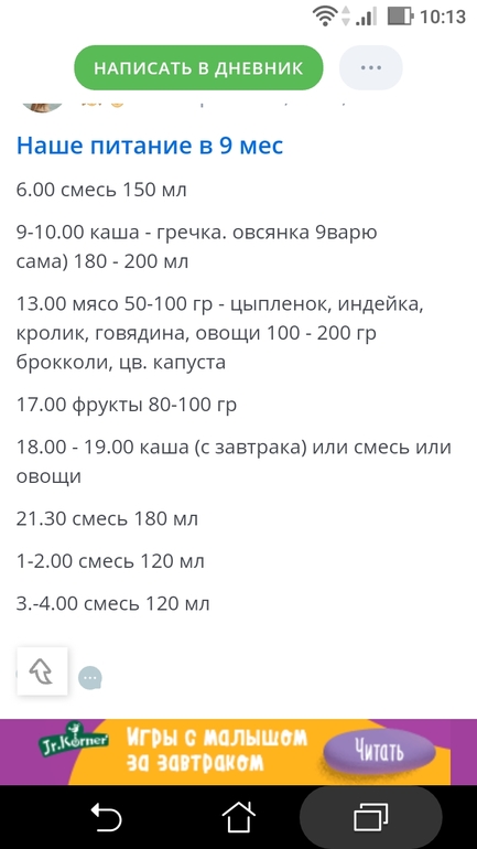 8.00-9.00-9.30 в зависимости от того когда пила смесь-каша 160 грамм( пока едим безмолочные)+ яблоко или банан в ниблере, компот или чай.