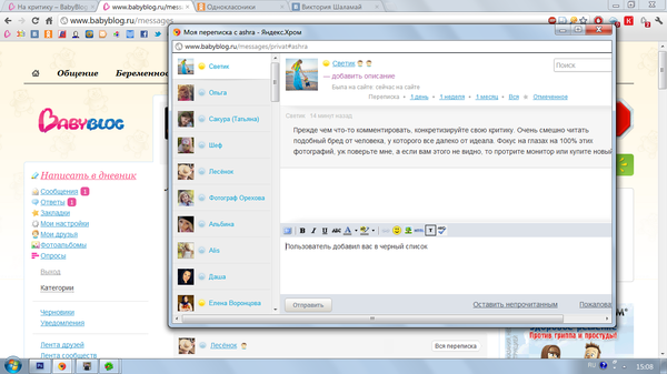 Книга отзывов и жалоби так как я в черном списке теперь у человека, которому не написала ничего плохого, хочу спросить, а зачем? Зачем грузить фото в сообщество если вы боитесь любой критики, если не можете адекватно отнестись к тому что кто-то может написать то что думает. Как уже писали в этом сообществе не помню кто к сожалению, но возможно свои слова человек узнает, звучало примерно так: " Если я хочу чтоб мне лили в уши о том как замечательны мои фотографии, я гружу фото в соц. сети". Не дословно но смысл передает. Я может чего не знаю, но недавно совсем читала Марусин пост про категории, так вот точно помню, что критика в этом сообществе разрешена в любой катигории. Моя критика звучала так: "Фокус потерян и это расстраивает, а цвета очень красивые!" Люди вы реально считаете что после этих слов, нужно в чс добавлять, лично я в шоке. Мне вообще стремно писать об этом, потому что тут у нас не "курилка" и я бы не написала, но в лс получила вот что О_о
