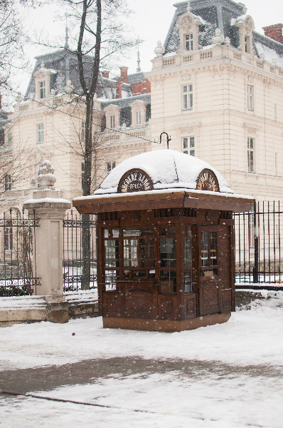 На заднем плане виднеется дворец Потоцких, который не удалось увидеть в близи, но фото делала, чтоб показать милые деревянные киоски с перссой, одинаковые по городу - такой себе стиль прям