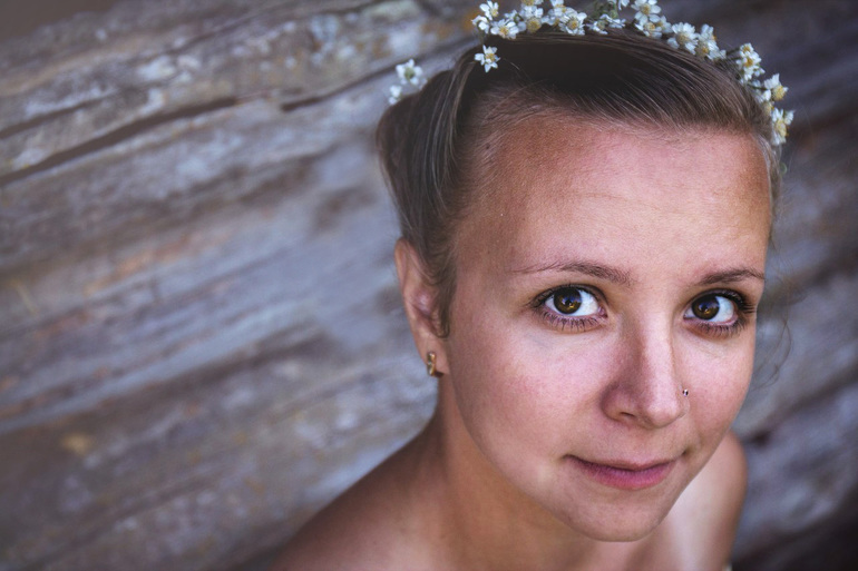 Очень мало места внизу. Правила, конечно, созданы для того, чтобы их нарушать — эта фотография не лучший пример нарушения правила ПТТ Исходник так же кадрирован? Чудесные ромашки в волосах, но думаю лучше будет ещё плотнее откадрировать. Акцент на глаза. Ну и ретушь, безусловно, не помешает