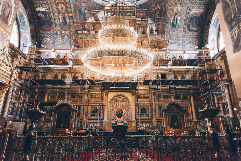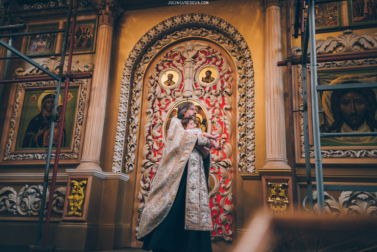 Был замечательный день, красивый свет из окон в приделе, где проводится Таинство. Но тут выясняется, что случилась накладка: два индивидуальных крещения случайно записали на одно время. И нашу малышку решили крестить у главного алтаря Храма, где сейчас ведется реставрация. Даже подумала про себя: "Эх!" =) И зря.