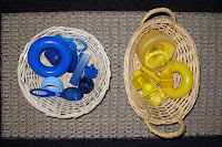 5) Begin simple pattern making with the foam shapes. This activity is best sitting on the floor so you have plenty of space to build a long pattern train. Begin by selecting two colors and alternating them in a line. After alternating about 6 times, ask your child to place the 7th shape in place. For example: red, yellow, red, yellow, red, yellow… “What comes next Charley??” Charley has a 50% chance of being right. Pattern recognition is a very important skill, but is also complex. If you child can’t select the right color after a couple tries while just alternating 2 colors, then perhaps it is best t select another activity and color back to pattern recognition a couple months later. If you child, can select the appropriate color then continue on! Increase the complexity by using multiple colors and shapes. Take turns being the one to create the pattern and being the one to complete it.