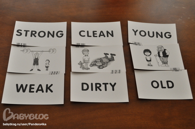Оборотная сторона не пустая, там тоже есть картинки (ч.б.) и к каждой картинке нужно подобрать два слова, это противоположности (например нарисованы шахматы и слова black/white), задание уже более сложное, для тех кто научился читать.