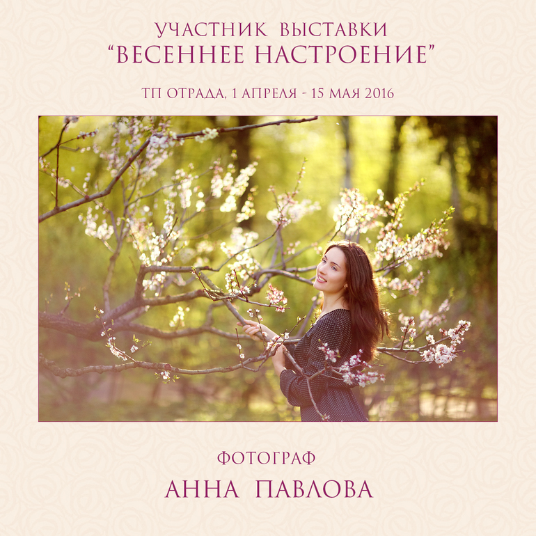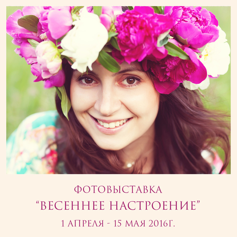 Приглашаем вас принять участие в новой фотовыставке «Весеннее настроение», которую мы открываем в Москве, в одном из крупнейших торгово-развлекательных комплексов Парк "Отрада", м. Митино. Даты проведения выставки 1 апреля- 15 мая 2016г.