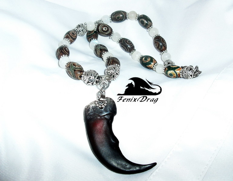искусственный (синтетический) коготь медведя Гризли, натуральный тибетский состаренный агат с ручной росписью, натуральный лунный камень - адуляр, фурнитура под серебро