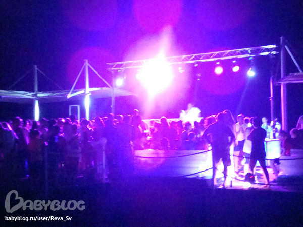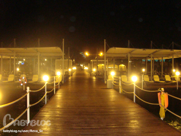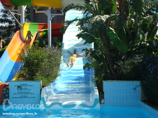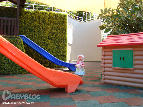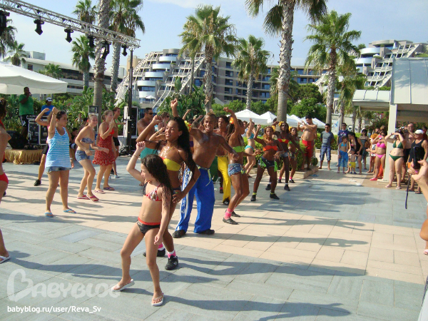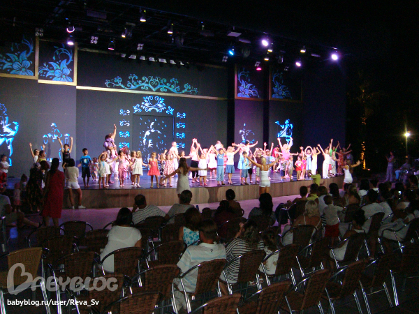 Отдельно выделена территория для времяпровождения с детьми или детей без взрослых. Она закрыта со всех сторон, дети оттуда не убегут физически, сверху натянут разноцветный большой тент, а двери открываются исключительно по нажатию кнопки, расположенной очень высоко (даже я на цыпочках доставала). Детский клуб работает с 10 до 23. Внутри столовая со своим поваром, т.е. обедать дети могут там же. Блюда деткого стола и пюрешки. Бассейн двухуровневый с водными горками, игровая территория на улице покрыта искусственным нескользящим покрытием под травку, горки, канаты, качели, «лазалки», домики и прочие детские аттракционы. Внутри помещения находится комната для малышек, где есть развивающие коврики, кроватки-люльки. Вся остальная территория – столы для рисования, лепки и т.п., сухой бассейн, ролевые игры типа магазин, кухня… Каталки, качалки, пластиковые горки. Работает климат-контроль. Есть туалетные комнаты и где поспать. Есть относительно большой кинотеатр, где показывают мультики на разных языках. За порядком следят несколько аниматоров, охрана, спасатели. Услуги няни платные. Аниматоры в течение дня разучивают с детьми танцы, песенки, готовят театральное шоу, а вечером на детской дискотеке все это демонстрируется родителям. Детская дискотека проводится на основной сцене перед анимационной программой. В темное время суток территория освещается фонарями и практически все деревья с красивой подсветкой.