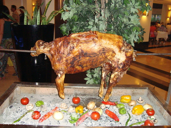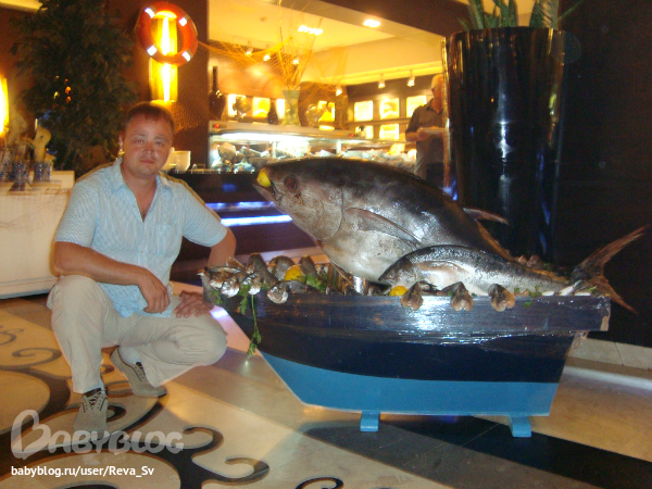 Что хочу отметить, так это меню основного ресторана. Широчайший ассортимент разнообразных блюд на любой вкус. Мясо: баранина, телятина, крольчатина. Птица: перепела, курица, индейка, утка. Рыба: лосось, дорада, тунец и еще какие-то. Морепродукты: мидии, осьминоги, кальмары, креветки. Нарезка мясная: язык, ветчина, мясо различное, колбасные и т.д. Мяса много и оно самое различное. Разнообразие сыров тоже поразило. Каждый вечер устраивается тематический ужин. Например: вечер итальянской кухни, вечер турецкой кухни, мексиканской, рыбный, японская кухня и т.д. На завтрак, обед или ужин всегда готовят какое-нибудь фирменное блюдо или несколько, т.е. готовят непосредственно при вас и индивидуально для вас. Всегда есть овощи в любых видах: свежие, соленые, острые, на гриле, на пару, салаты. Салаты, кстати, очень разнообразные и вкусные. Особенно понравились салаты в итальянский вечер. Фрукты-ягоды по сезону. Десертный стол великолепен: торты, пирожные, пахлава, десерты. Есть и диетический стол. Всегда два вида супчиков, а рядом рассыпь тарелок с добавками к супам: мясо, специи, зелень, овощи, сухарики и прочие. На завтрак яйца во всех проявлениях (от сваренного за 3 минуты, 5 минут… 10 минут, жаренные, омлет и т.д.), два вида молочных каш (правда, иногда чувствовался вкус подгоревшего молока), мясные нарезки, сосиски (вполне съедобные). Диетический стол с различными вареными овощами и мясом и даже десертами для диабетиков. Детский стол представлен в виде баночек с фруктовыми, овощными пюрешками, йогурты «Данон», всякие хлопья, мюсли и прочий «птичий корм». Тут же стоит микроволновка и блендер. Наша малышка с удовольствием кушала кашки, супчики, овощи на пару и фрукты. Пюрешки турецкого производства есть отказывалась - хорошо, что брали свои. Для детей есть обеденные столики на колесиках. Все блюда подписаны трех языках, т.ч. языкового барьера нет нигде. Наши всегда улыбались, когда читали: «Капуста обмотки» - это голубцы J.