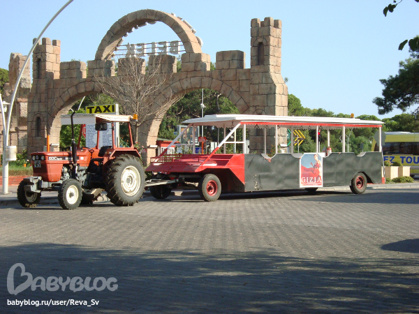 Территориально отель расположен в нескольких километрах от поселка Белек. Если выйти за ворота отеля, то вы не увидите ничего кроме длинной дороги, с одной стороны которой расположена огромная территория гольф-клуба, а с другой соседние отели. Нет ни одного магазинчика или ларька. Все это только в Белеке. Можно прогуляться пешком, займет минут 30-40. Можно воспользоваться такси от отеля до центра Белека 7$. Также каждые полчаса по дороге ездит трактор с тележкой. Этот «Эх, прокачу» (так мы его назвали) стоит 1$ с человека. Трактор объезжает по маршруту отели и направляется в поселок. Туристический центр Белека небольшой, минут пять-десять ходьбы без остановок. Там все, как обычно: магазинчики, сувениры, кафешки и т.д. Далее идут жилые дома и ничего интересного. На такси можно проехать в Кадрию (7-8 км), там все раза в два дешевле. В Белеке есть пара-тройка достопримечательностей. Символ Белека – морская черепаха.