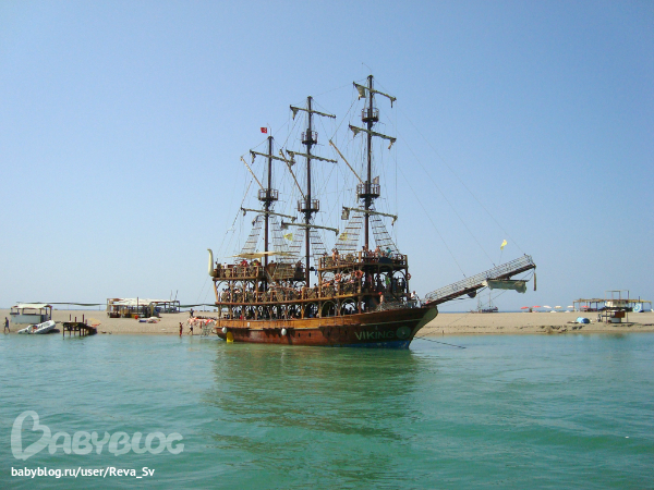 Мы воспользовались третьим вариантом – услугами Белек Дуги Тур. Проспекты с ценами, на нескольких языках получили в офисе, в Белеке. Позвонили владельцу, он через 10 минут приехал в отель, все рассказал, показал, объяснил на ломанном русском, но мы поняли друг друга J. Выбрали два тура – покататься на яхте вдоль побережья. Один тур от Сиде до черепашьего берега (за Аланьей), другой от Кемера до Фазелиса. Трансфер до Сиде, Кемера и обратно – миктоавтобус мерседес с кондиционером. Немного тесновато, т.к. с других отелей набились немцы, но приемлемо. В Сиде яхта большая, плавали весь день, встретили дельфинов, вернулись вечером уставшие, но довольные. В Кемере яхта (баркас) небольшая, народу мало и прогулка более приятная получилась. Немцы попались очень наглые и жадные до еды, а «ихние киндерс» неуправляемые. 9 мая, после тех прогулок, теперь наш основной семейный праздник.