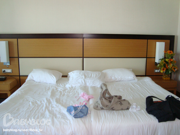 Сам номер достаточно просторный, порядка 50 кв.м. Две полутораспальные кровати, которые составили вместе, и небольшая кровать для подростка. Предложили для малышки принести детскую кроватку, но ее наличие уменьшало простор, поэтому мы отказались. Доча спокойно спала в небольшой кроватке, предусмотренной номером. Минибар с прохладительными напитками: две пепси, два спрайта, две фанты, два пива Эфес, пара бутылок воды, пачка чипсов, три пачки соков (200 мл), пара банок диетической колы. Это в небольшом холодильнике. На тумбочке электрочайник, стаканчики, пара кружек, россыпь чайных пакетиков разных, кофе (3-1, 2-1), сахар и сахарозаменитель. Все пополняется ежедневно. Большой раздвижной шкаф, внутри сейф. Большой ЖК телевизор, около 50 каналов, включая русские. Интернет проводной и беспроводной. На балкон стеклянная раздвижная дверь, при открытии которой автоматически отключается кондиционер, тем самым, исключая сквозняки в принципе. На балконе два кресла и столик. Кондиционер центральный, на стене удобный пульт. Охлаждает хорошо и не дует как вентилятор. За время отдыха никто не переохладился, никаких чиханий, насморков и отитов не было. Ванная комната тоже просторная. Большая раковина, набор косметики: гель, лосьон, шампунь, кондиционер, крем, мыло, пена для ванной, банка с ватными дисками, палочками и одноразовыми пилочками. Увеличительное зеркало с подсветкой. Фен настенный, пылесосного типа, неудобный (700 Вт), т.ч. если Вы привыкли пользоваться им каждое утро, то лучше возьмите с собой более мощный. Сама ванная акриловая, с дверцами из стекла. Слив работает прекрасно, вода не застаивается нигде. Освежителя нет, что почитать берите с собой J. Вентиляция отличная. Еще в комплекте банные халаты, тапочки и полотенца. Все белоснежное и очень приятное. Меняется ежедневно. Постельное меняют если не каждый день, то через день. Причем желаемое время уборки номера можно оговорить с администраторами отеля. Короче говоря: чисто, красиво и уютно. Лебедей крутили только два раза, от чаевых не зависимо. Хотя, учитывая уровень данного отеля, лебедей могли бы делать ежедневно.