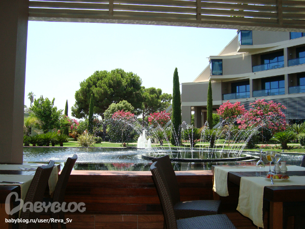 В ресторане, как и в барах, много официантов. Стоит только «занять» столик (никогда не нужно было ждать, пока освободится, столов более чем достаточно, т.ч. обедать, ужинать и завтракать можно было свободно в любое отведенное для этого время), сразу подходит официант, спрашивает, что принести из напитков. Рекомендую турецкий чай и кофе. Приносят любой ассортимент из бара. Использованную посуду убирают очень оперативно. Также в зале ходят девочки с подносами, которые предлагают отнести ваши тарелки к столику или помогут подержать, пока вы накладываете себе еду. Если вы закончили трапезу, то за вами тут же все убирают, стелют новую свежую скатерть и сервируют заново для других. Помимо основного зала с кондиционером можно пообедать на летней терассе в окружении фонтанов, или расположиться за столиками на мостиках, перекинутых через водоемы (вечером там хорошо - прохладно). Мест хватает всем и в любое время. В ресторане предлагают столовое вино, исключительно бутилированое и приятное на вкус. Красное, белое или розовое. Несмотря на широкое разнообразие блюд складывается единая тематическая концепция. Все приготовлено очень вкусно и в достаточном количестве. Всего хватает всем. Здесь нет очереди из туристов перед дверью за полчаса до открытия ресторана и очередей за шашлыком, как в некоторых других отелях. Посещая ресторан в любое время (т.е. в начале обеда или уже перед закрытием) наличие еды стопроцентное. Так же никто не был замечен с тарелкой, выносящий еду за пределы ресторана. Внешний вид отдыхающих так же соответствовал этикету, не видно было мужчин в купальных трусах и майках, а девушек в бикини. Все плав-средства (матрацы, круги и т.д.) люди, идущие на обед или ужин с пляжа, оставляли перед входом в ресторан.