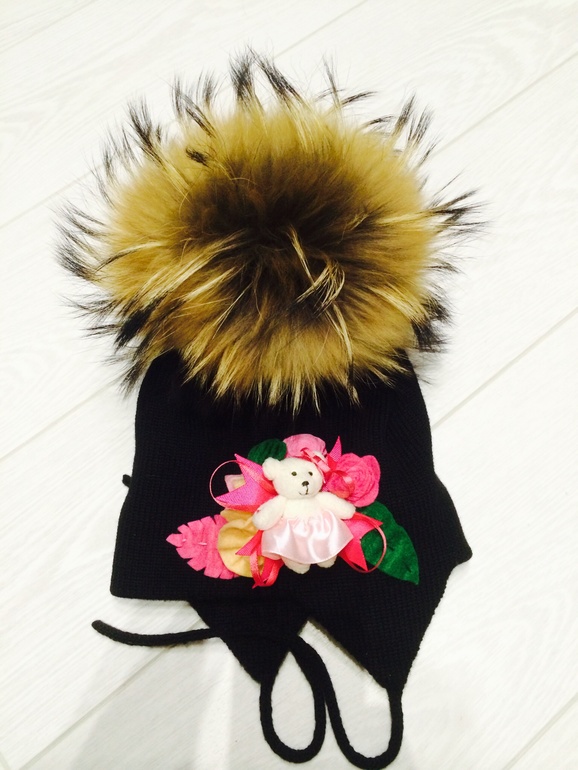 2. Шапочка черная на зиму, двойная вязка, новая-не носили, помпон енот.48-50 1700р