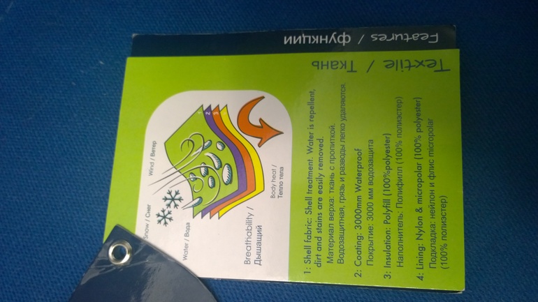 На спине, груди и капюшоне утепление. На коленях и попе дополнительное усиление ткани (от протирания).