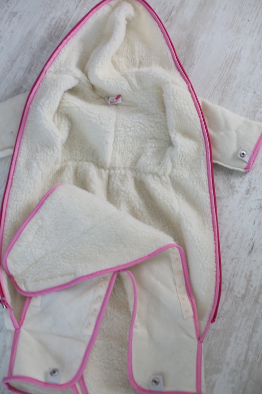 Капюшон расстегивается и конверт можно использовать как теплое одеяло или плед, или накидку на ножки.