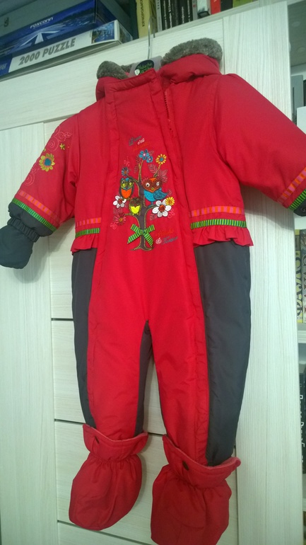 Комбинезон яркий, теплый (дополнительное термобелье не требуется), до -30, водонепроницаемость 3000. В комплекте варежки и пинетки.