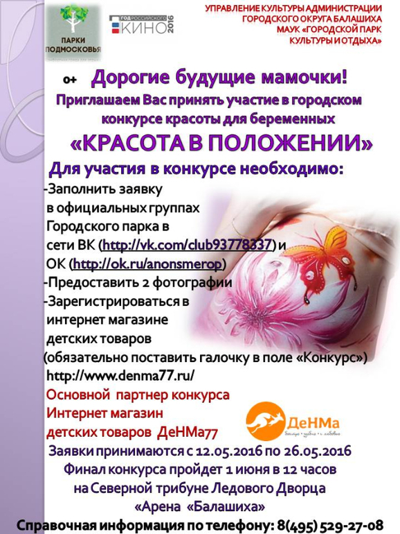 Городской Конкурс «Красота в положении» проводится Управлением культуры Администрации Городского округа Балашиха, МАУК «Городской парк культуры и отдыха» и Детским интернет магазином DeNMa77 (, группа в ВКhttp://)