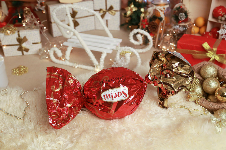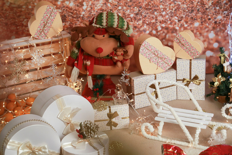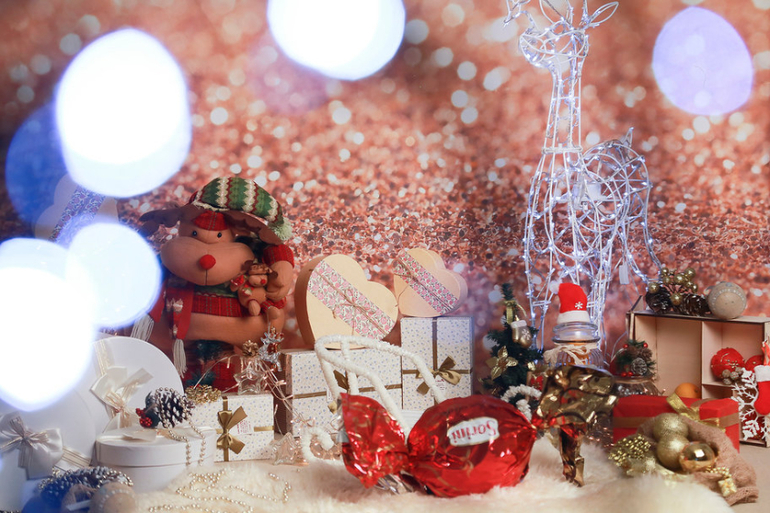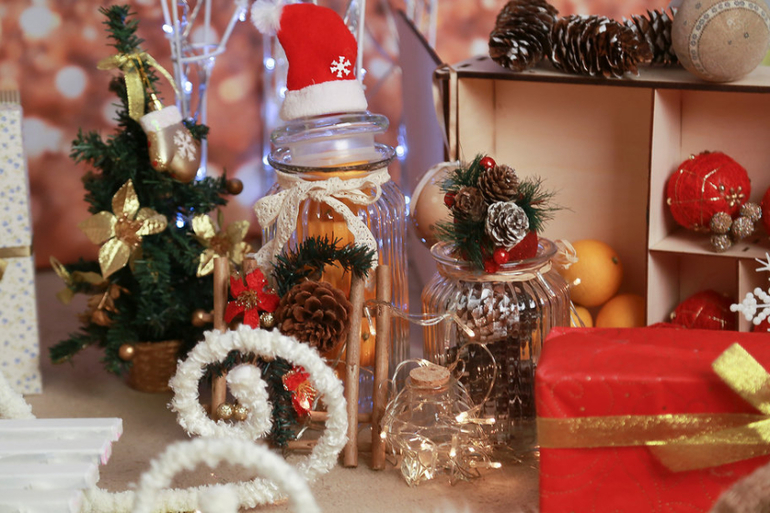 яркими новогодними декорациями.