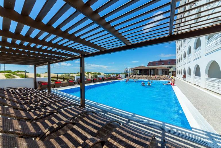 На территории работает подогреваемый бассейн, анимационная команда, детская комната, собственный песчаный пляж!