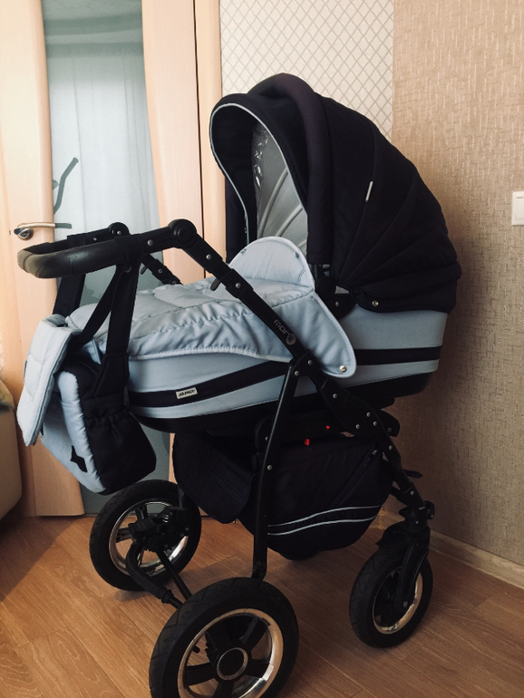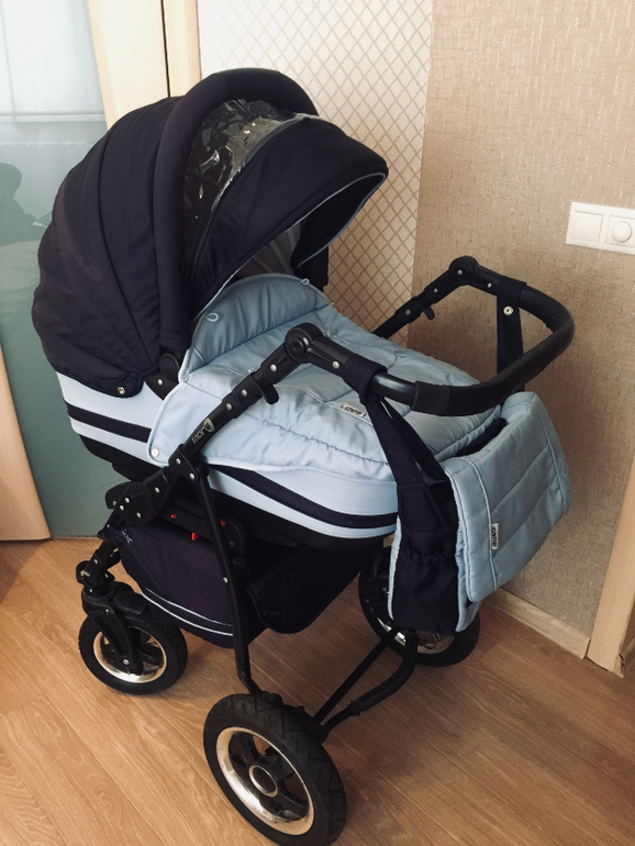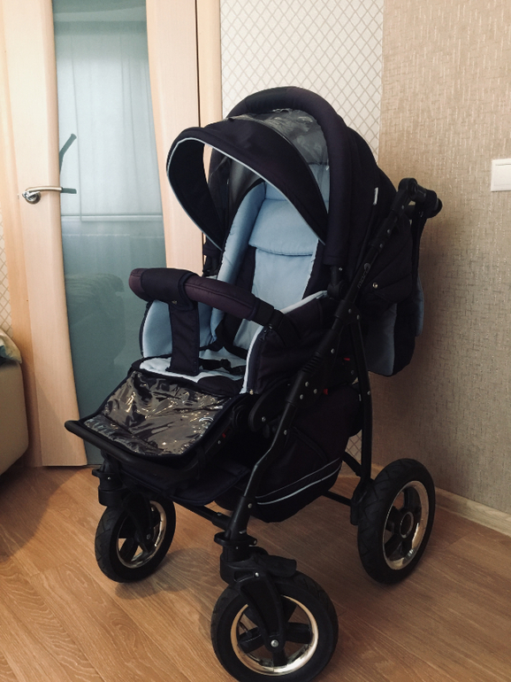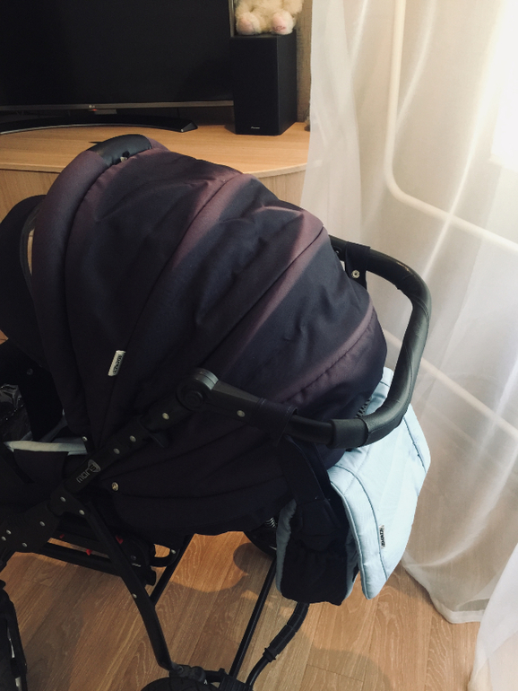 От одного ребенка. Долгое время стояла на балконе. Немного выгорел козырек на обоих блоках, на колесе отломано несколько штучек и перекосилась оконтовка на ручке, на эксплуатацию не влияет. Коляска очень маневренная и удобная, готова к использованию, постирана.