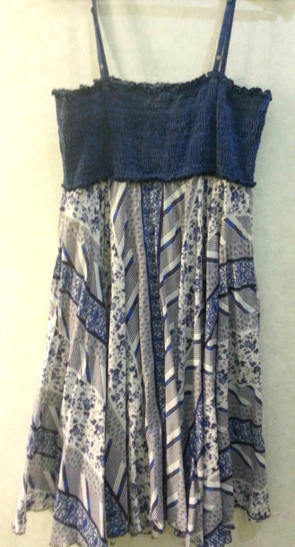 Цвет синий, с принтованным рисунком в виде орнамента и цветов. Одевается через голову, молний и каких-либо застежек у сарафана нет.