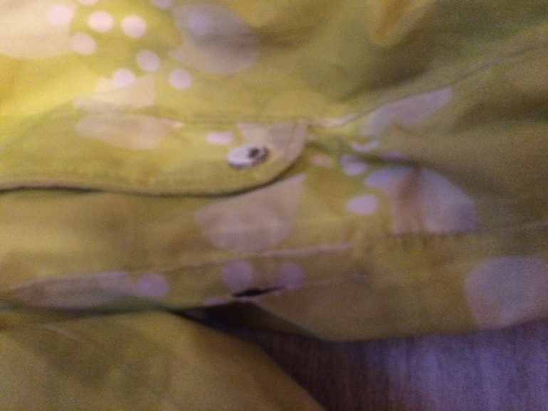 Немного лопнул шов (см.фото). Не насквозь!! На коленках тёмные пятна (не очень видно-см. фото), стёрта краска на кнопках (см.фото).