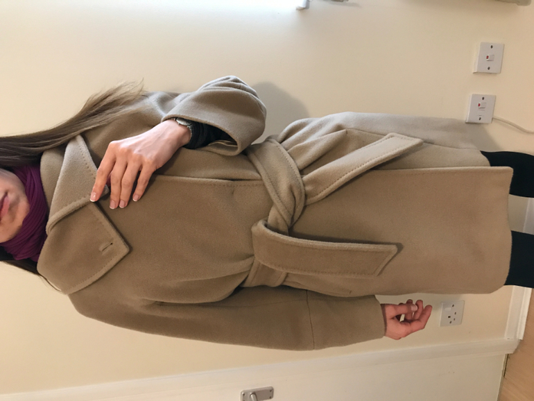 Идет на размеры S и M, т. к. есть пояс. С поясом будет приталенный вариант, без - оверсайз-кокон. Цена - 12 000 руб. Возможен разумный торг.
