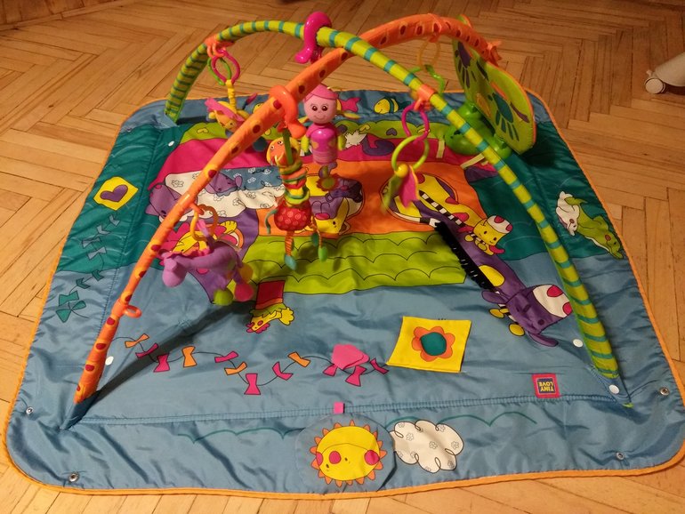 ПродамБольшой напольный коврик с различными по текстуре и форме подвесками стимулирует развитие зрения, мелкой моторики и координации движений. Безопасное зеркало в мягкой оправе можно крепить на дуге или коврике с помощью липучек.