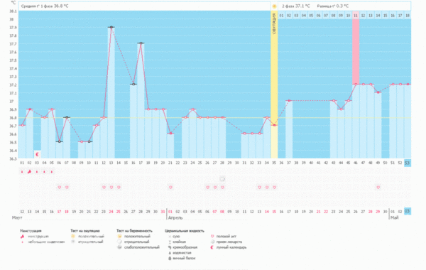 В тот момент когда не мерила плюнула на график думала О не будет, потом как осенило и решила померить. Очень удивилась что БТ 37,2 так как выше чем 37,1 ни когда не поднималась. Потом интересно стало и вот такую картинку график нарисовал))) Очень надеюсь, что это долгожданная Б. Пытаемся уже полтора года.