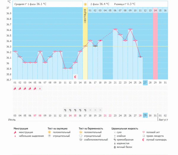 Ну, немного не понятно почему средняя линия на 36,3, я бы опустила ее ниже и поставила О на 14-й день все же, если бы от руки рисовала. Я думаю надо в следующем цикле измерять БТ ректально, чтобы сделать правильные выводы. А то пока похоже, что проблемная немного 2-я фаза, низкий уровень прогестерона - и низкая и коротковата. Но все это относительно. По одному графику делать выводы нельзя, тем более с оральным способом измерения. Удачи Вам!