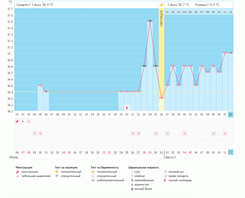 Беременность, признаки по БТ, есть ли шанс?Что происходит? Первой части графика нет. т.к. уезжала в отпуск и не мерила. Приехала 26 июля (это 21 ДЦ) - после этого все измерения верные. 23, 24 и 25 ДЦ высокая БТ т.к. болела. А потом она опять опустилась и поднялась, из чего я сделала вывод, что О была на 26 ДЦ. Вторая фаза у меня 12 дней. Вот вопрос - БТ-то не падает, а тесты чистые. Вот и что думать? Вот график: