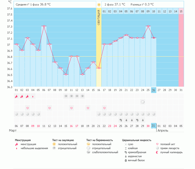 Здравствуй Полинка. По поводу твоего графика хочу сказать, что темпа 2 фазы нормальная, но разница температур не достаточна для Б, хотя бывает Б и при такой разнице. Мой график был такой же (2 фаза и темпа и разница температур). Я тоже надеялась, но... не судьба! Может у Вас будет по другому!